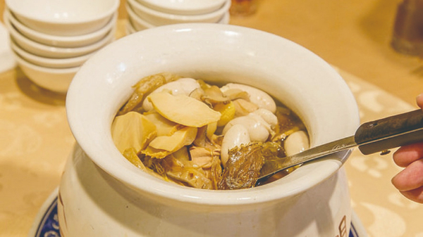 佛跳墙“过海”后,用于炖制高汤的鸡鸭、猪脚、鲍鱼、干贝等食材大体不变,但一些微妙变化悄然出现,最显著的是台式汤头加入了笋干与芋头等台湾特产。