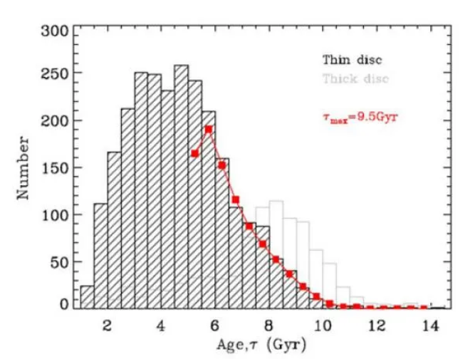 图为LAMOST-Kepler红巨星样本的年龄分布,黑色线代表薄盘恒星,灰色线代表厚盘恒星。红色点线代表模拟数据得到的最符合观测的年龄直方图,拟合表明,薄盘星最古老的恒星年龄约为95亿年。