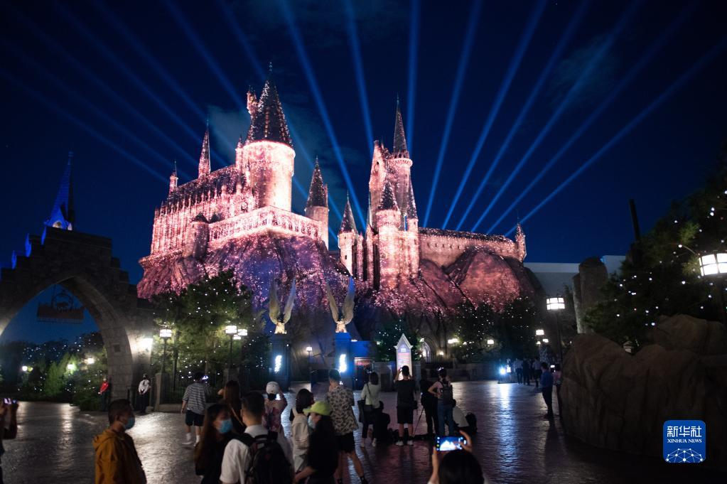 游客在观看北京环球影城哈利·波特的魔法世界主题景区霍格沃茨城堡夜间灯光庆典表演。新华社