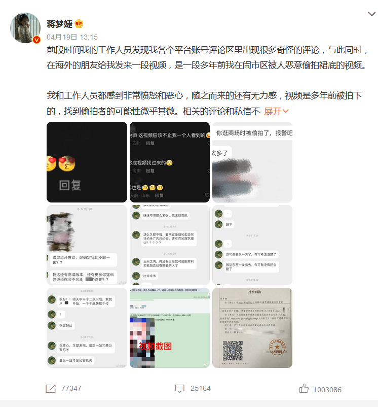 19日,中国演员蒋梦婕发布长文称,多年前自己在闹市区被人恶意偷拍裙底,视频近日在网上大肆传播,甚至有人借机勒索,严重影响了其工作生活,蒋梦婕透露,自己和工作人员报警后,借机勒索的嫌疑人已在异地被警方控制。