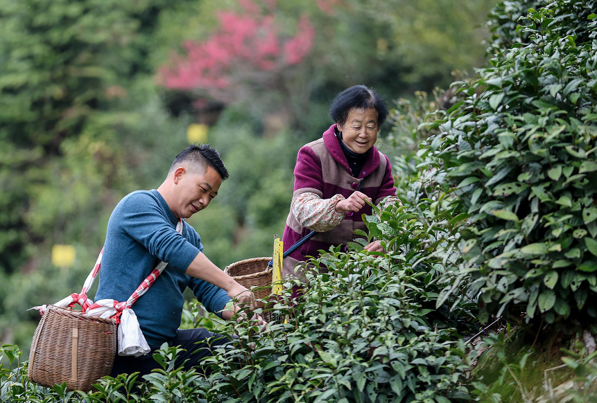 茶农在安徽省黄山市徽州区富溪乡采茶。中新社