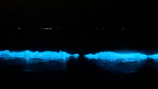 《海报新闻》报道,暗夜中,随着波浪,蓝光在海面上发散开来,仿佛满天星光散落在海浪里。