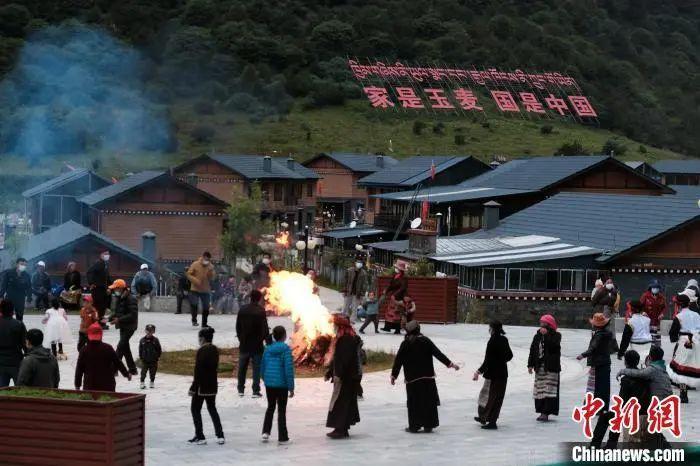 图为2021年8月5日,西藏自治区隆子县玉麦乡民众围着篝火欢快地跳锅庄舞。中新网