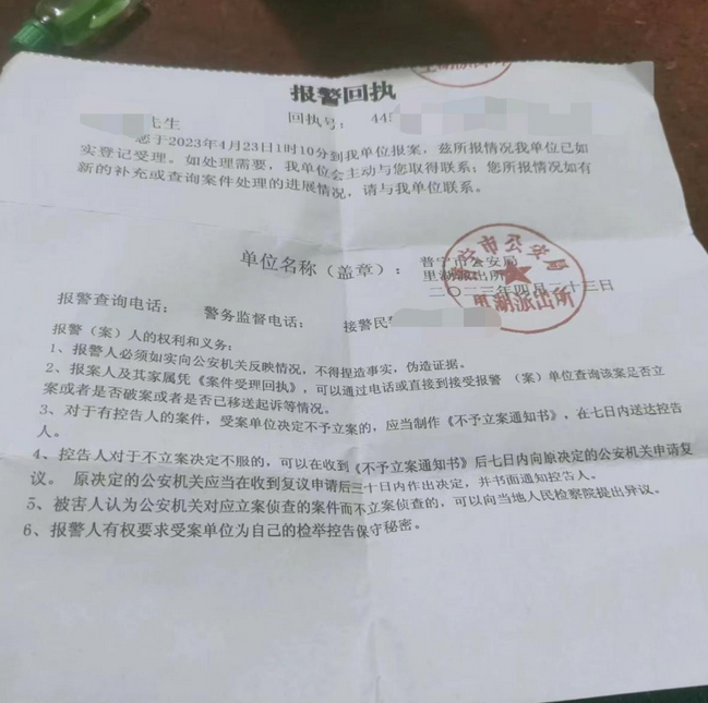 失联人员家属的报警回执。《广州日报》/受访者供图