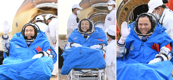 6月4日,神舟十五号载人飞船返回舱在东风着陆场成功着陆,现场医监医保人员确认航天员费俊龙、邓清明、张陆身体状态良好,神舟十五号载人飞行任务取得圆满成功。图为航天员费俊龙(左)、邓清明(中)、张陆(右)安全顺利出舱。中新社