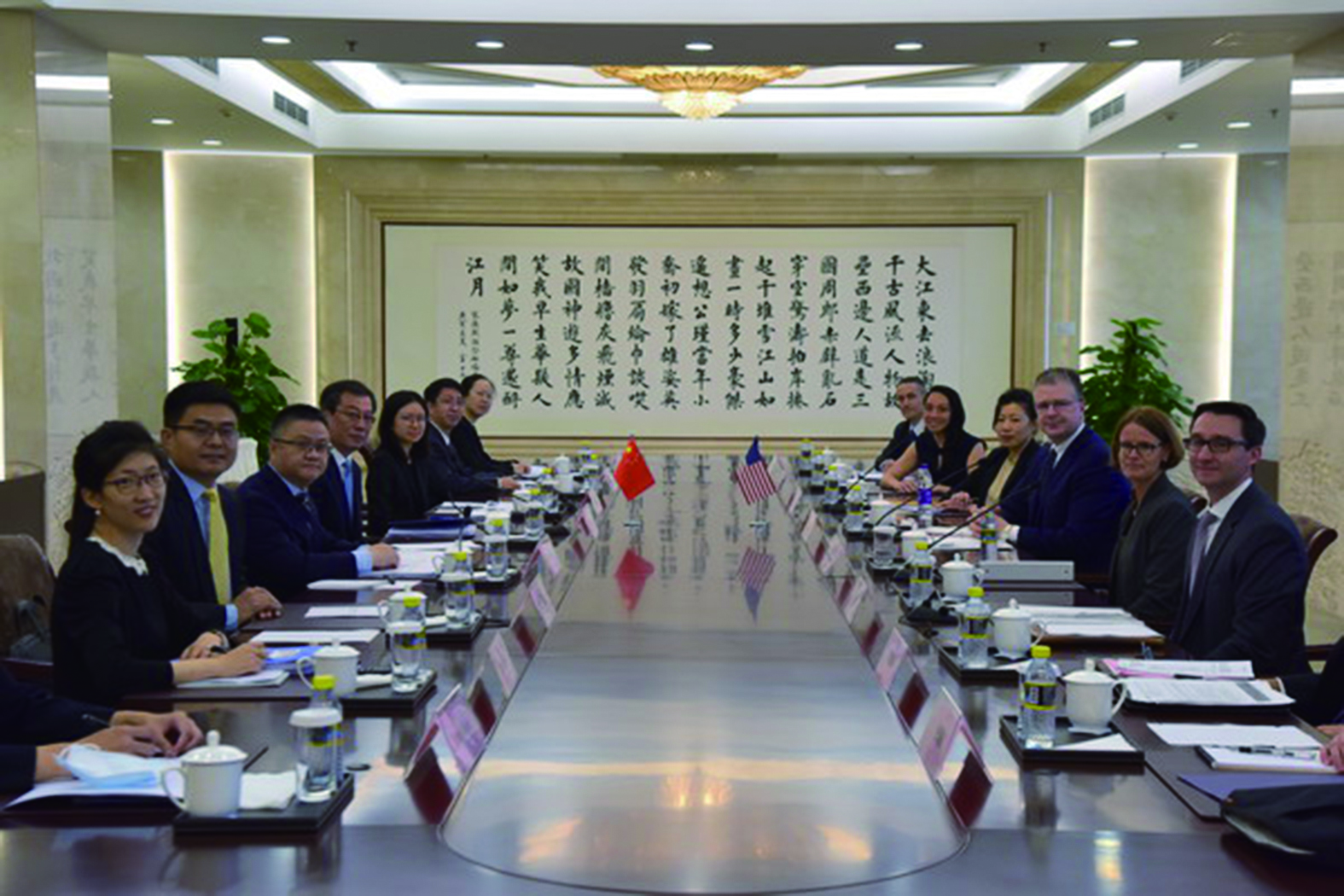 中国外交部美大司司长杨涛(左四)等中国官员,与美国国务院亚太事务助理国务卿康达(右三)、白宫国安会中国事务高级主任贝莎兰(右二)等美国官员举行会谈。中国外交部网站