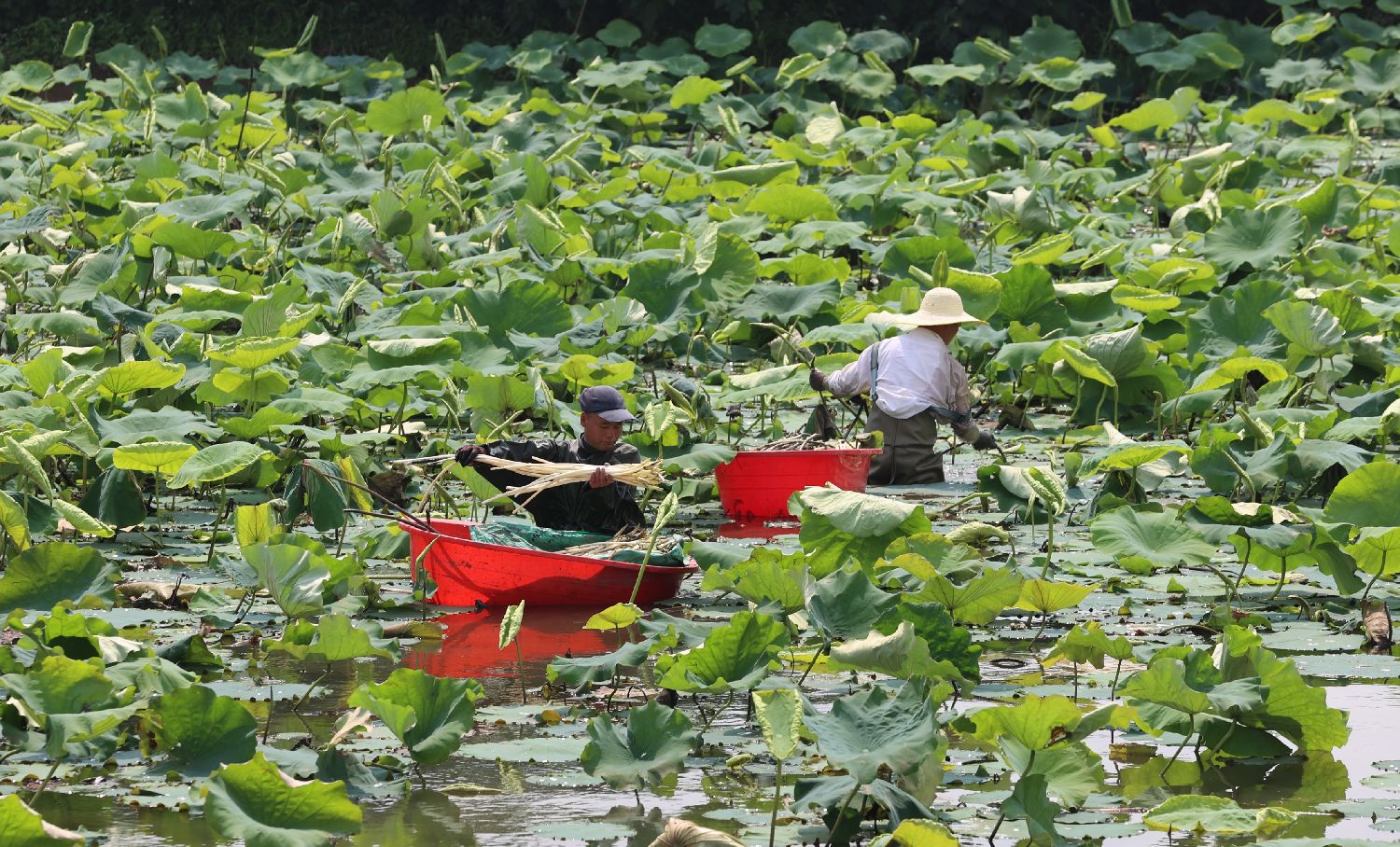 5月23日,武汉蔡甸藕农正在荷塘里“抽”藕带。 中新社记者 张畅 摄