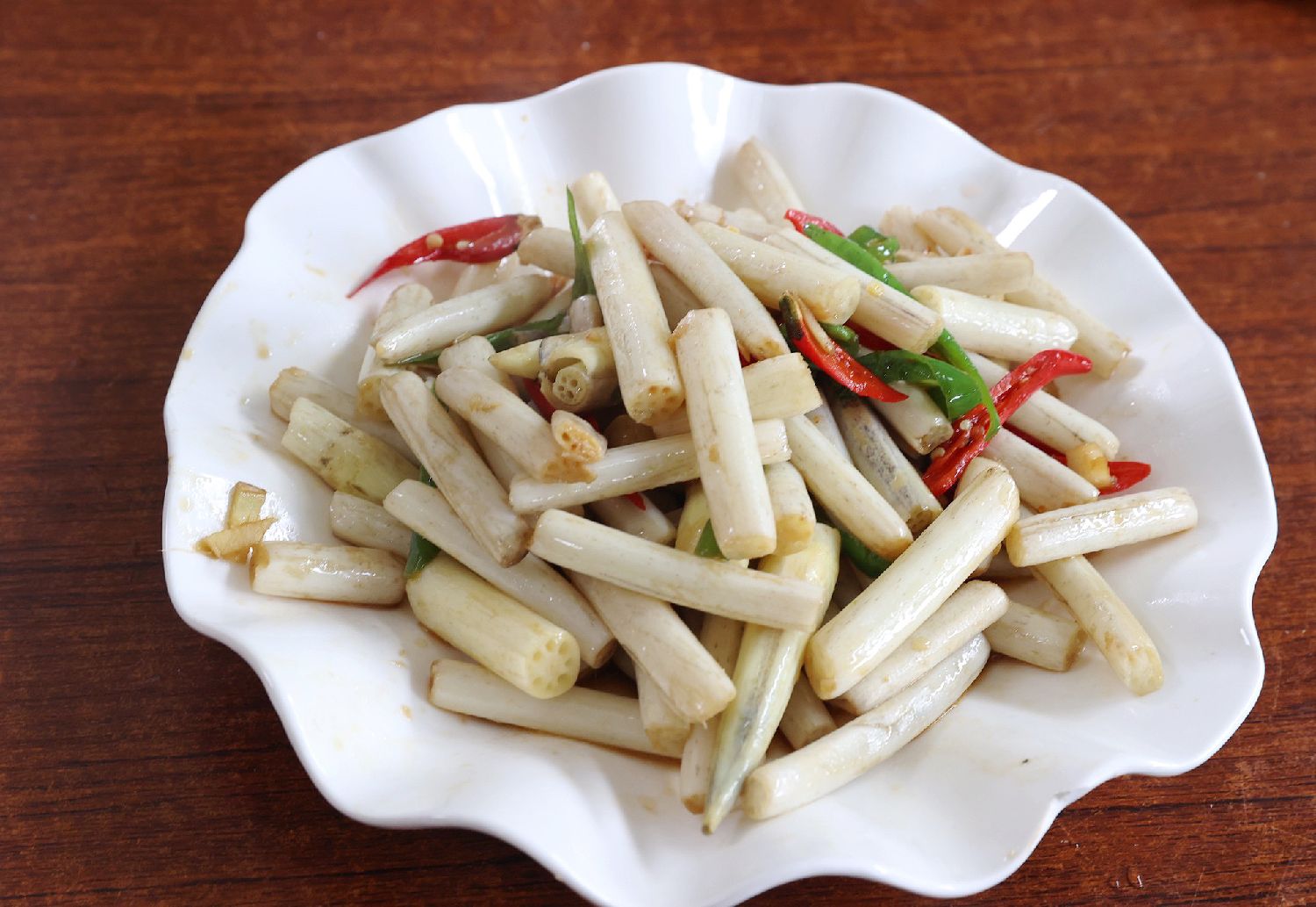 取藕带三根,斜刀切至两寸长短,佐以少许青、红辣椒,蒜片和盐,烈火烹油翻炒三分钟即可出锅。时间不可过长,否则嚼之如蜡,颜色氧化发黑。