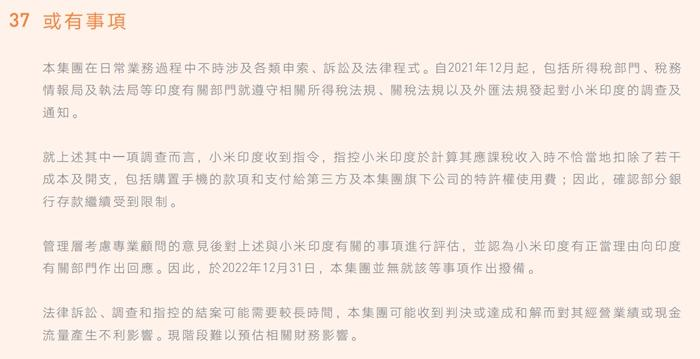 据小米年度报告自述,自2021年12月起,包括所得税部门、税务情报局及执法局等印度有关部门就遵守相关所得税法规、关税法规及外汇法规发起对小米印度的调查通知。就上述其中一项调查而言,指控小米印度计算小米应课税收入时不恰当地扣除了若干成本及开支,包括购置手机的款项和支付给第三方及本集团旗下公司的特许权使用费。