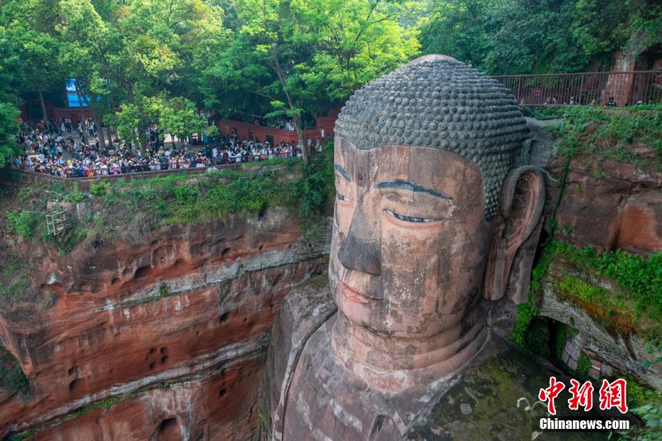 今年“五一”假期间,游客们有序观乐山大佛。中新网