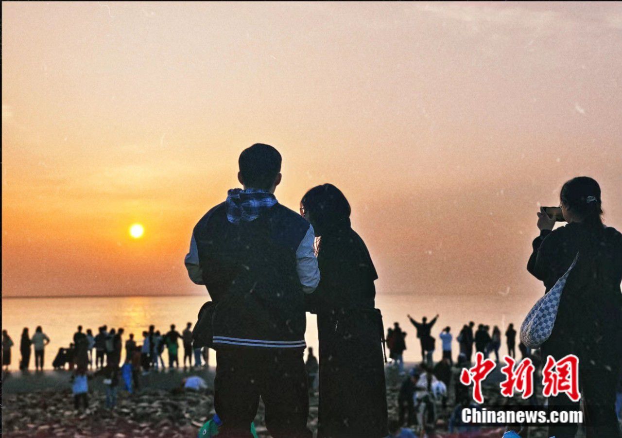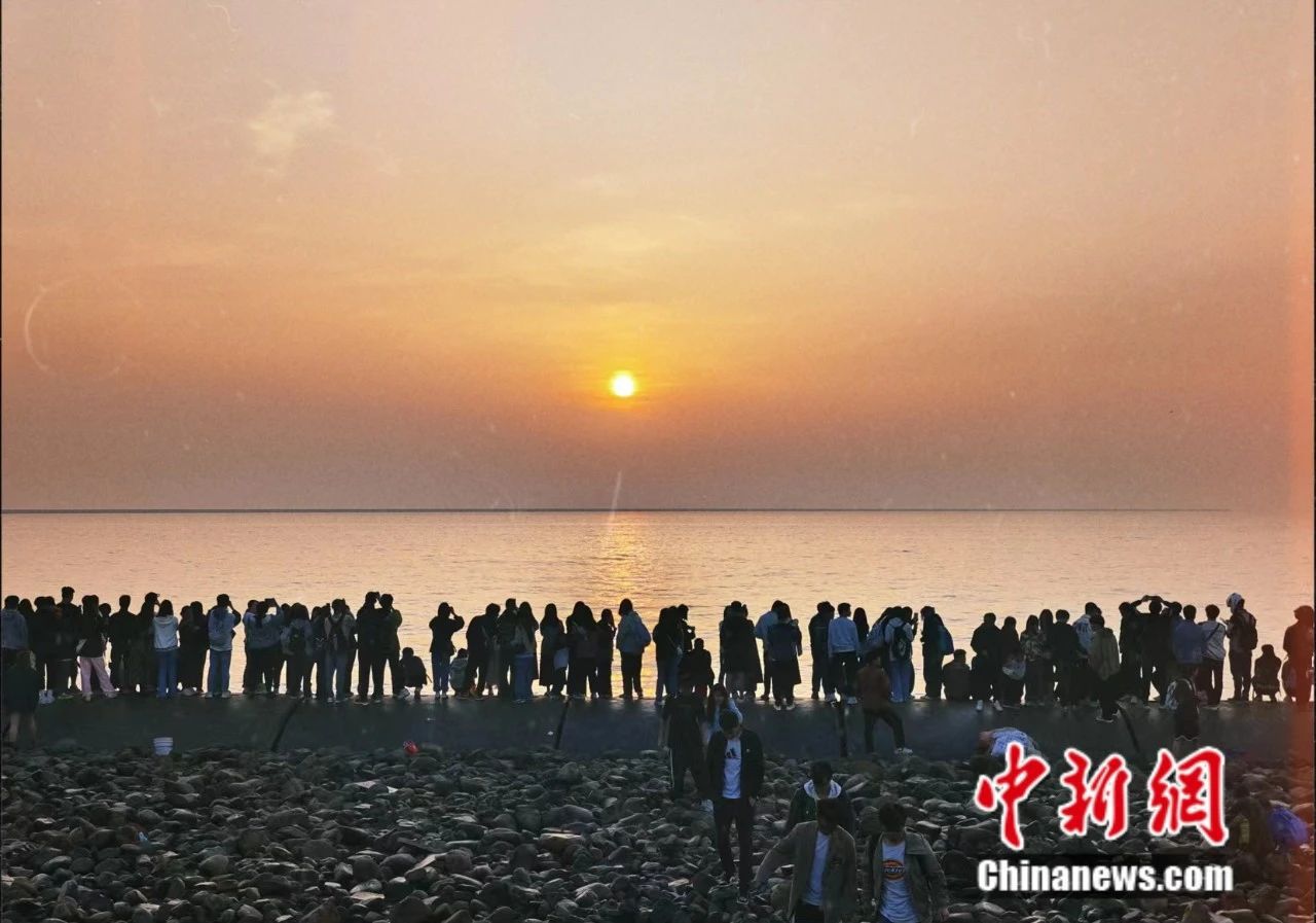 图为2023年五一期间来自四面八方的人们在观看海上日出。中新社