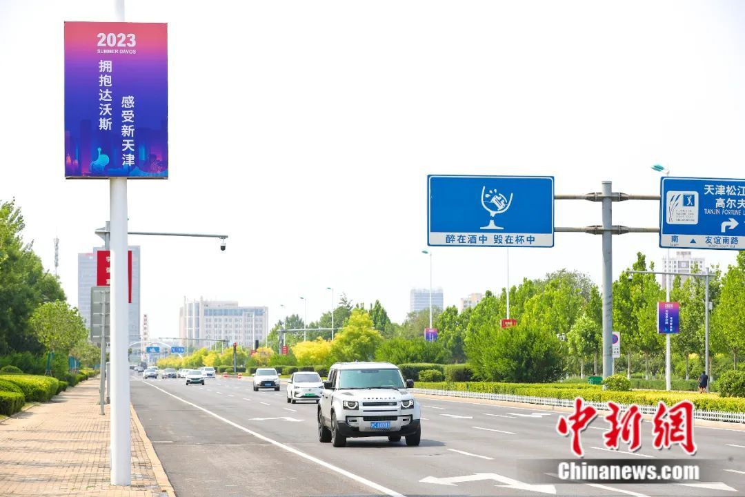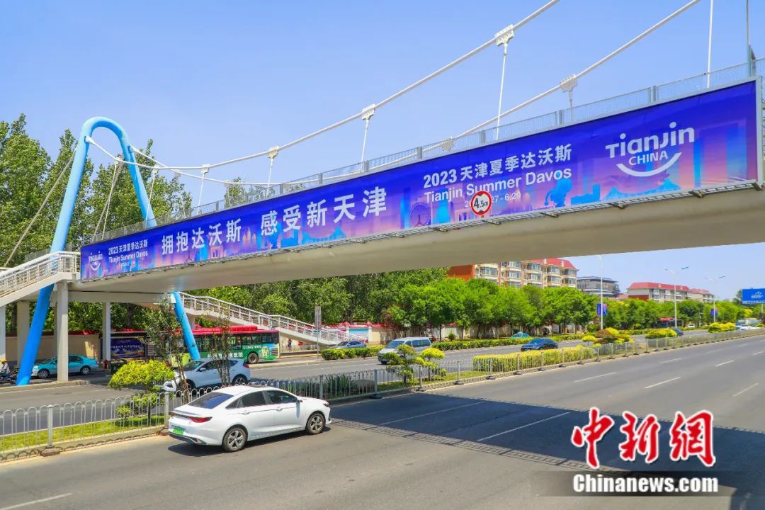 天津主干道、人行天桥悬挂着“拥抱达沃斯感受新天津”等内容的宣传标语。中新社