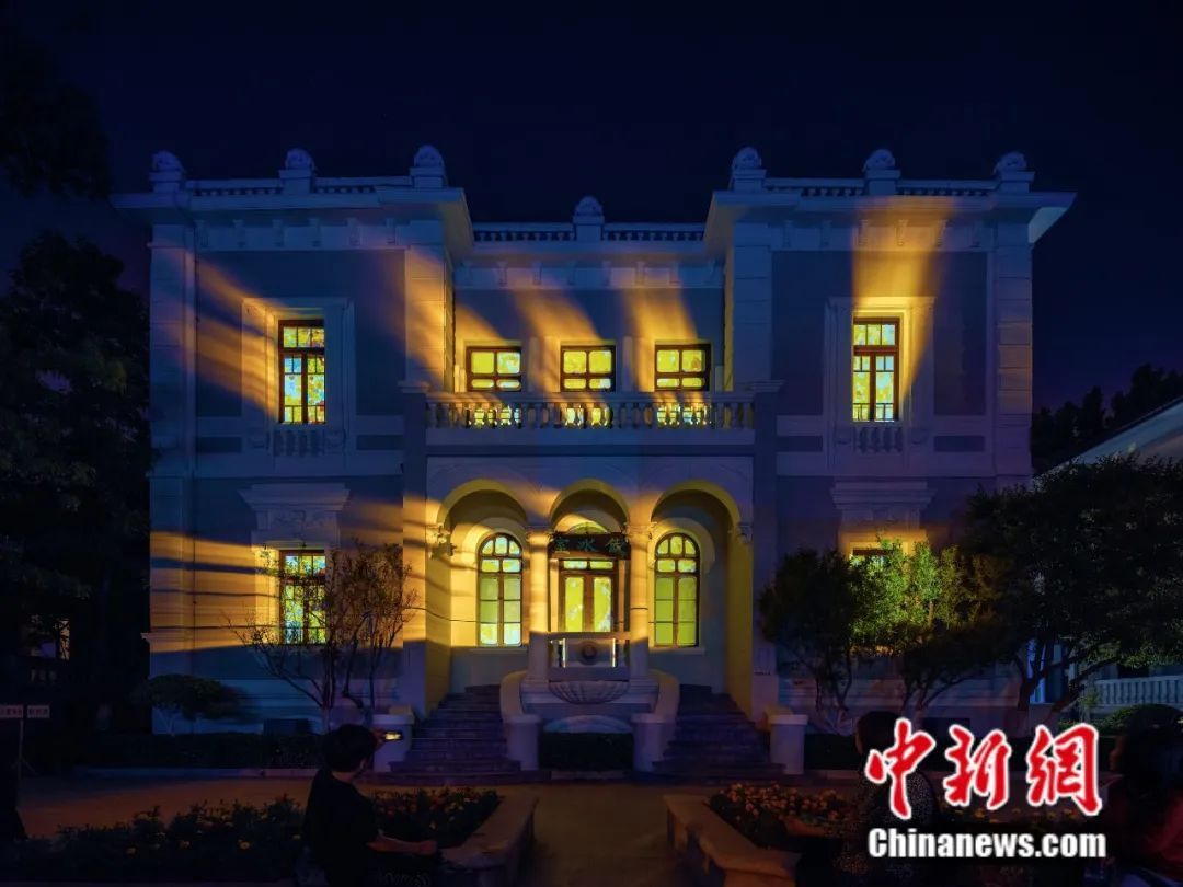 图为“五一”假期,位于天津市意风区的梁启超故居纪念馆建筑外墙开启灯光秀表演。天津梁启超纪念馆供图