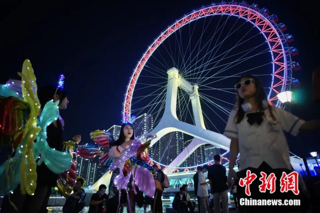 图为“五一”假期,作为天津游览海河景观带网红地标之一的天津之眼摩天轮“新装亮相”,吸引了游客前来打卡。中新社