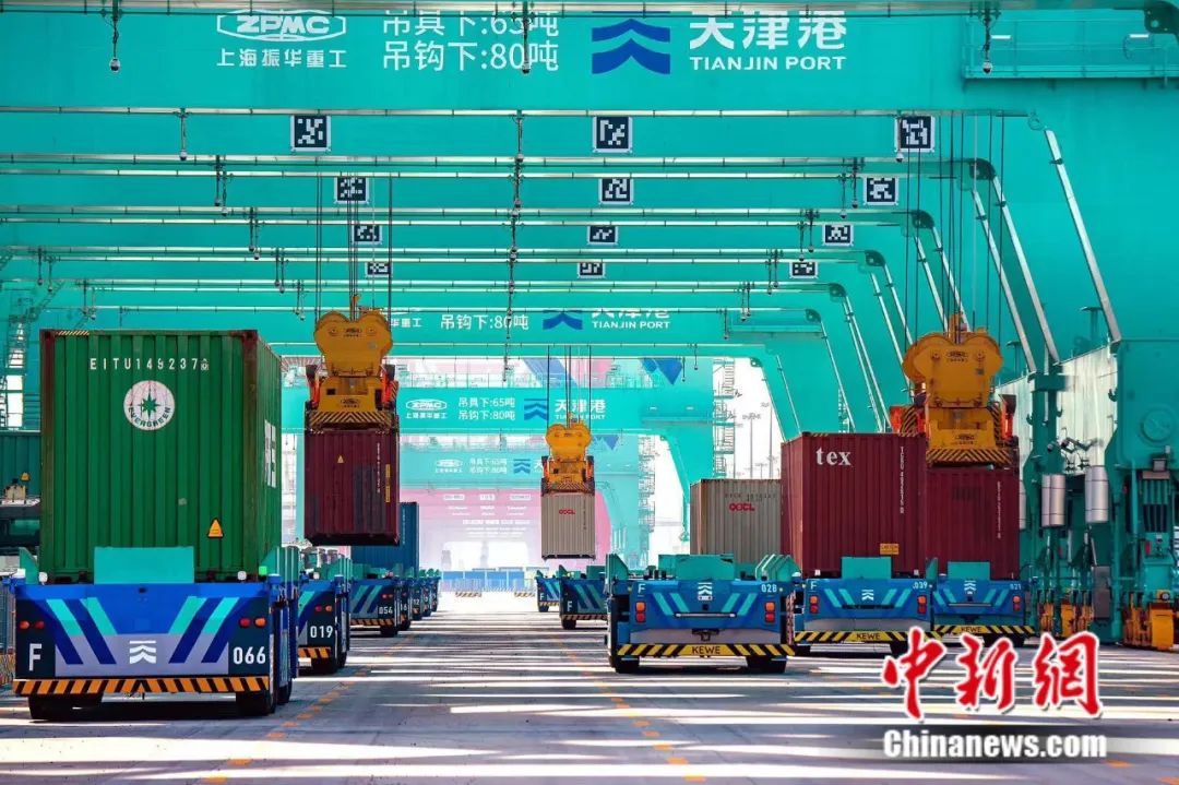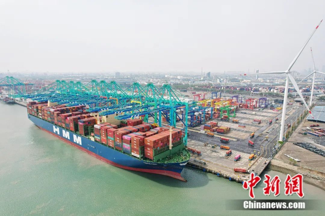 图为2023年4月6日,“现代哥本哈根”轮顺利靠泊天津港北疆港区C段智能化集装箱码头开始进行装卸作业。中新社