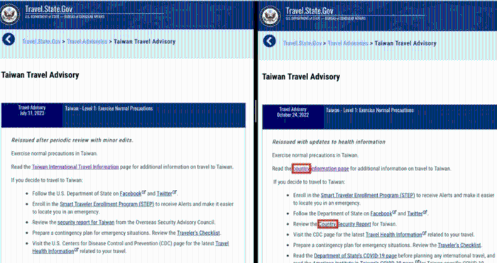 比较两个版本的差异,发现在去年的版本中,建议欲前往台湾的旅客,可上“国家讯息网页”(country information page)查询更多信息;也可以查看台湾的“国家安全报告”(Country Security Report for Taiwan)。