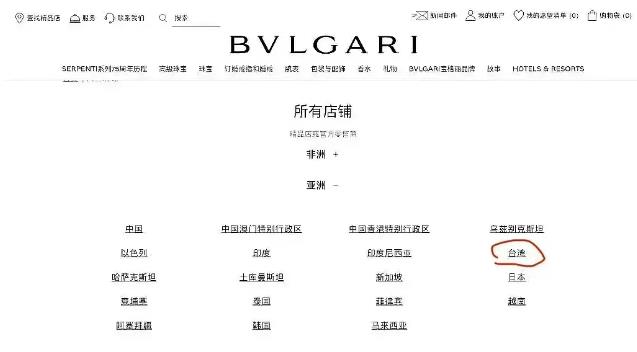 北京中国经济网报道,此外,7月11日,有网民发现,在奢侈品牌宝格丽(BVLGARI)官网的店铺分布信息中,香港澳门前加了“中国”二字,而在台湾前并未加“中国”二字。该行为引发网民质疑,认为宝格丽此举是在将台湾单独列为一个“国家”。