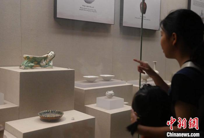 2023年7月13日,人们在安徽博物院参观“宋三彩卧女抱鹅枕”(左上)。中新社