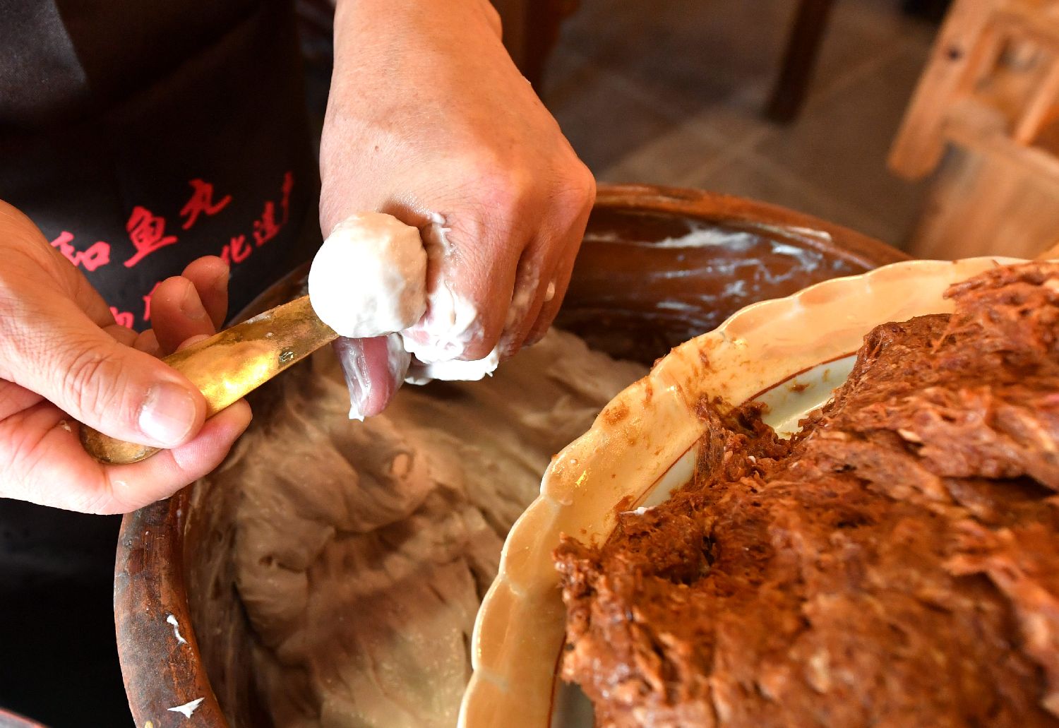 4月14日,永和鱼丸制作技艺第四代传承人刘景舒双手配合默契,一粒圆滚滚的丸子很快就出自他手。 中新社记者 吕明 摄