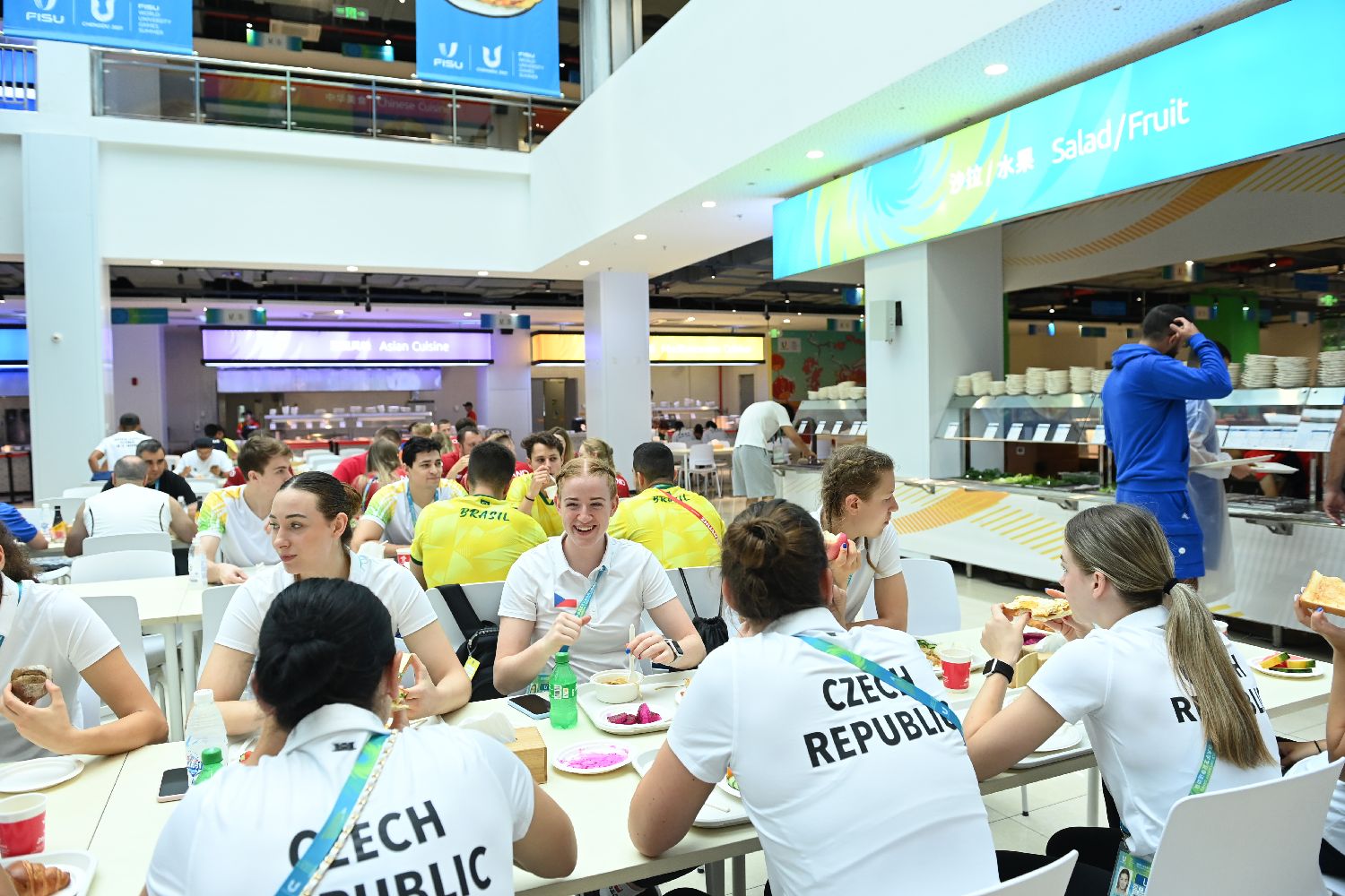 7月27日,在成都第31届世界大学生夏季运动会运动员村,外籍运动员在食堂就餐。中新社