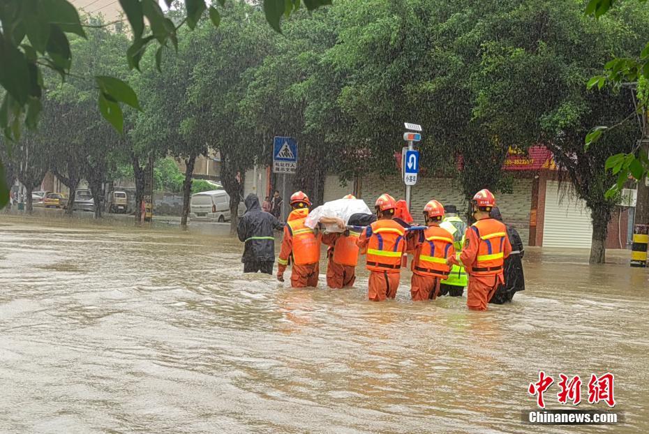 今年第5号台风“杜苏芮”28日在福建晋江沿海登陆。图为消防救援人员涉水转移受困者。中新社