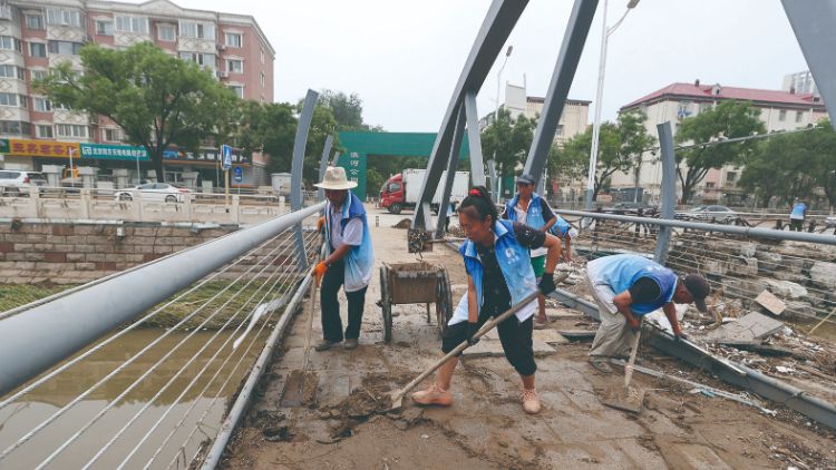 3日,北京市门头沟区,工作人员清理一座过街天桥上的淤泥。中新社