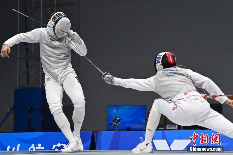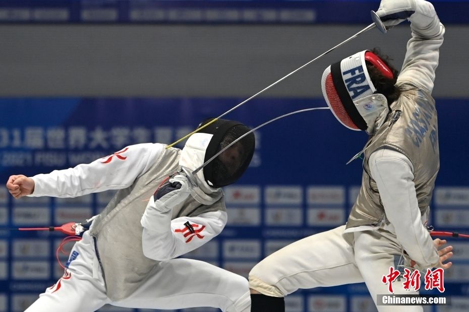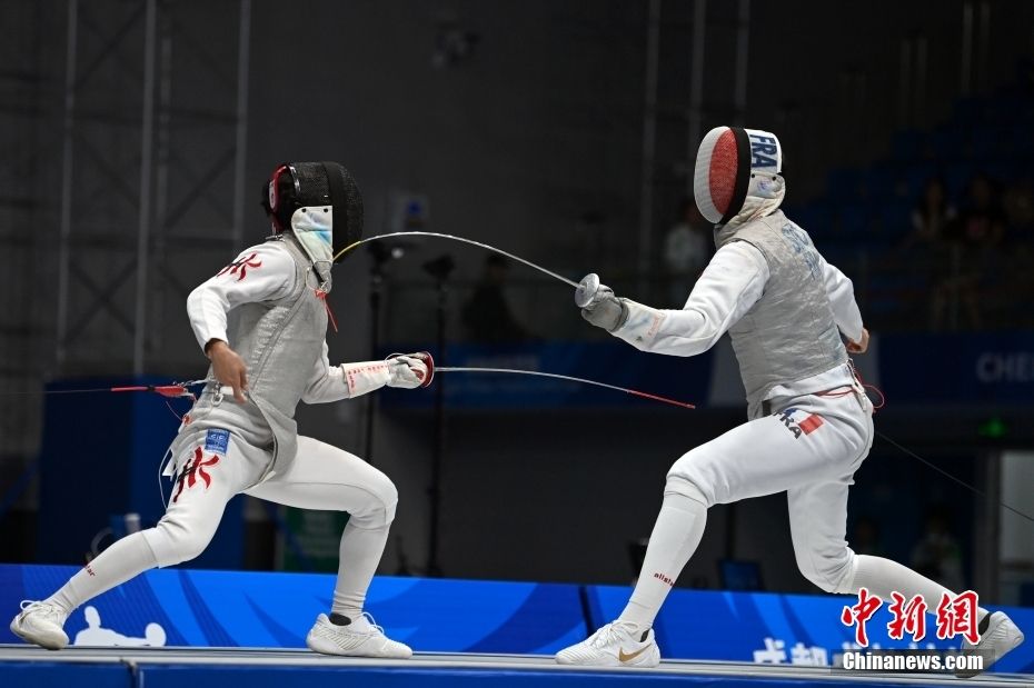 8月7日,在成都举行的第31届世界大学生夏季运动会击剑项目男子花剑团体金牌赛中,中国香港队45:33击败法国队获得金牌。图为中国香港队选手张家朗(左)和法国队选手SIDO Alexandre, marie, michel在比赛中。中新社