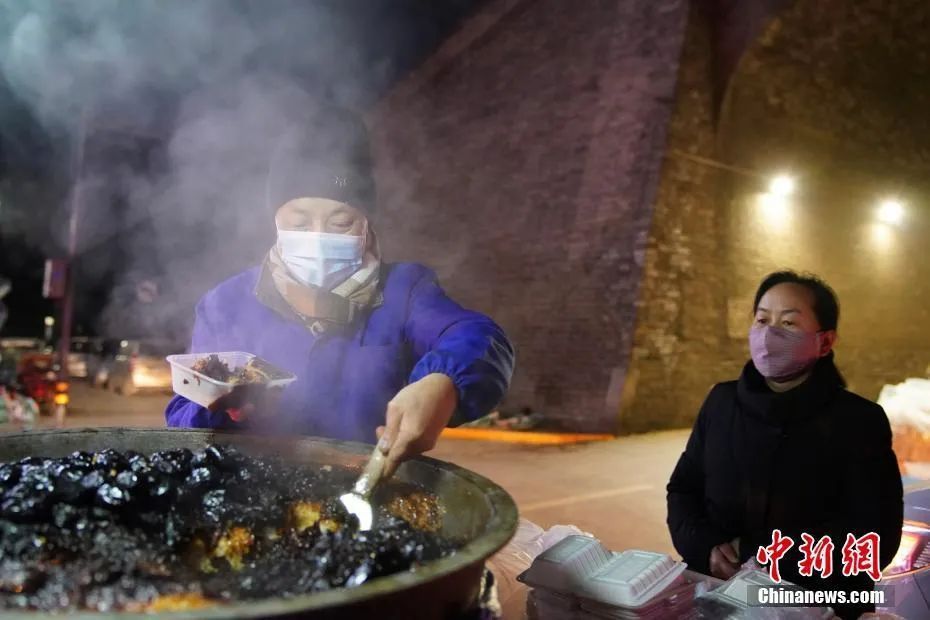 西安小南门早市上的商家为顾客盛甑糕。中新网