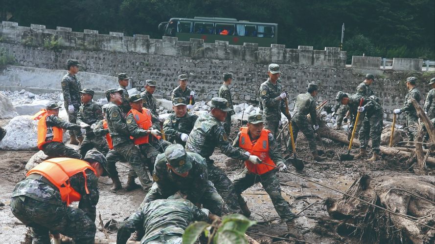 12日,武警陕西总队西安支队官兵正在开展救援清理工作。中新社/武警陕西总队西安支队供图