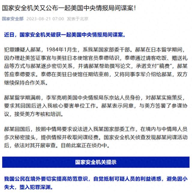 中国国家安全部官方消息称,这并非官方首次发布间谍案。不过,与此前几次通报案例不同的是,这次通报的间谍案中,点名曝光了“美国中央情报局”。