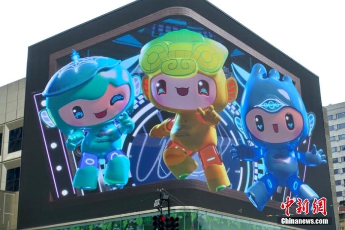 4月1日,亚运吉祥物(由左至右依次为莲莲、琮琮、宸宸)裸眼3D宣传片在杭州市西湖区文三数字生活街区开播。中新社