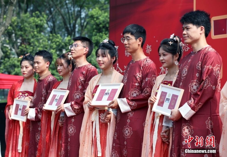 8月22日,新人在四川成都一起展示结婚证。中新社