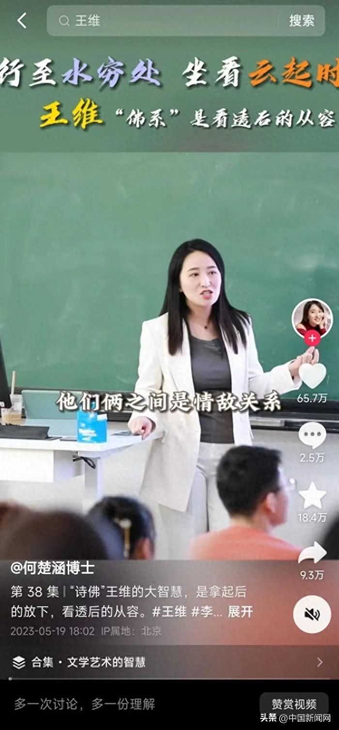 何楚涵把讲课片段上传到了抖音,六个月的时间吸粉百万,一篇讲诗人王维的视频,收获了超65万点赞,“王维和李白同岁,他们俩之间是情敌关系”。何楚涵讲道,王维长得帅、精通音律、诗又写得好,因此被玉真公主看上了,后来王维结婚,玉真公主终生未嫁。而李白又是爱过玉真公主的,李白和王维都生活于长安,有杜甫、孟浩然、王昌龄等共同好友,但王维和李白一生几乎没有任何对话,很有可能是情敌关系。