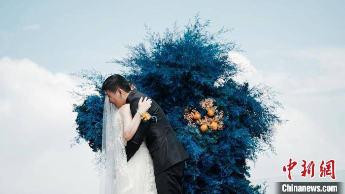 在天蓝色的主色调中,同一片天空下两朵自由自在的“云朵”相遇了,共同飘向远方……这是婚礼策划师赵冲为一对新人打造的梦幻婚礼方案。