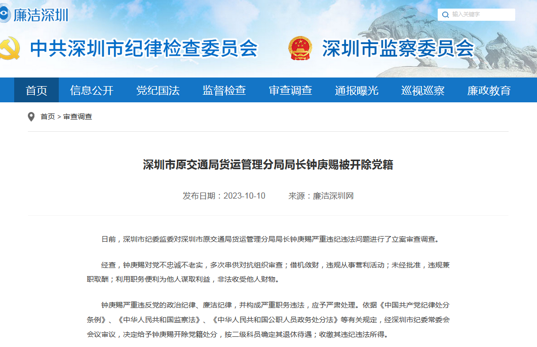 10月10日,广东深圳市纪委监委通报,对深圳市原交通局货运管理分局局长钟庚赐严重违纪违法问题进行立案审查调查。
