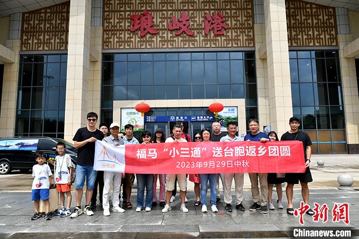 9月29日,台胞台属在福州马尾琅岐港进站口前合影,准备搭乘福马“小三通”航线返台过中秋。中新社