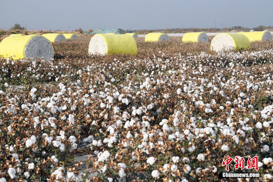 图为新疆喀什地区麦盖提县的棉田里盛开的棉花和已经采收好的“棉蛋”。中新网