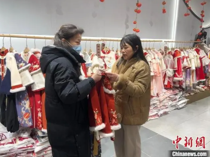 武汉市民许女士前来为孙子购置一套“新中式”童装,“为过年做准备,样式很喜庆,学校里很多孩子都穿。”