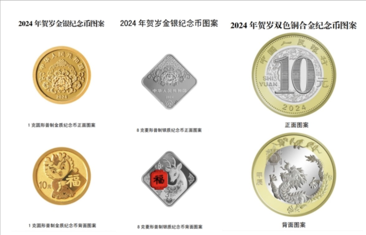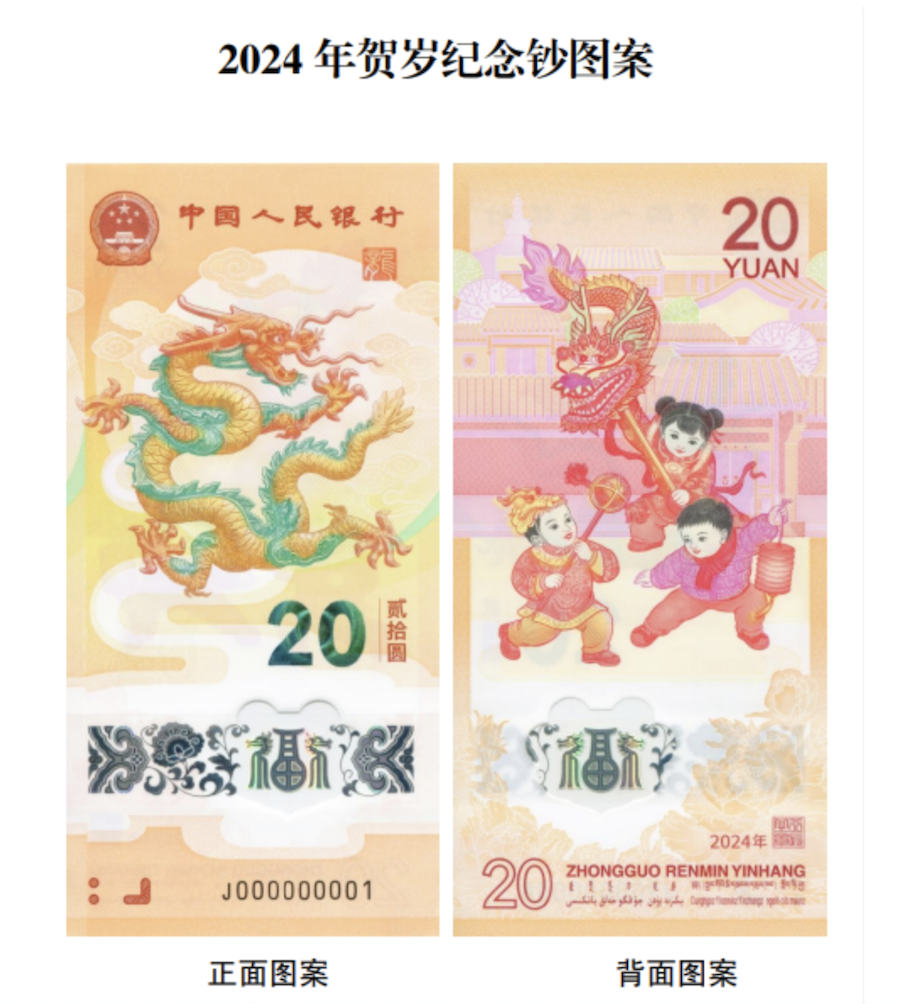 据悉,本次发行的2024年贺岁币面额10元,材质为双色铜合金,发行数量1.2亿枚,背面设计了中国传统剪纸艺术与装饰年画元素相结合的龙形象,衬以花灯和灵芝。2024年贺岁钞面额20元,采用塑料材质,发行数量1亿张,正面主景为龙的造型图案,背面则设计儿童舞龙灯图案,辅以北京四合院民居装饰图案。