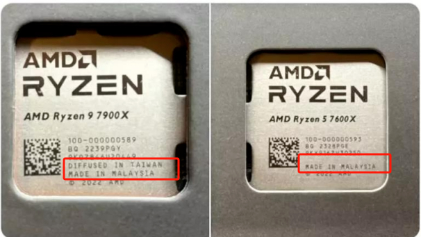 新款美国超威半导体公司“Ryzen7000”系列CPU(右图)上“台湾制程”(Diffused in Taiwan)的字样不见了,“马来西亚制造”(Made in Malysia)的标识仍然存在。台北联合新闻网资料图