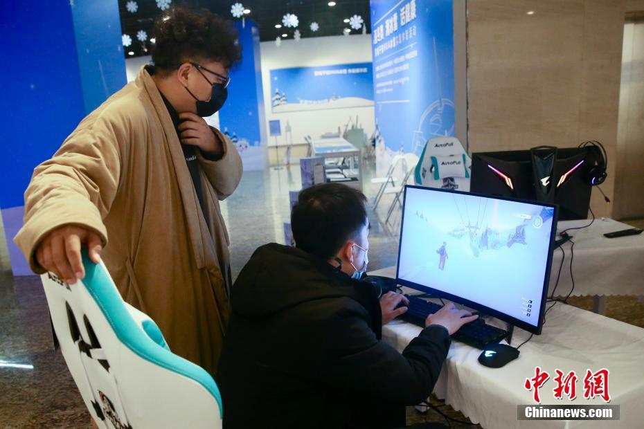2021年12月15日,市民在北京世纪坛艺术馆体验冰雪运动电子游戏。中新社资料图
