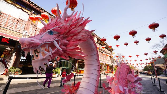 云南省昆明市商圈里摆放的龙年艺术装置,过年氛围感十足。中新社