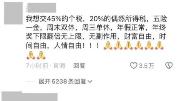 “我想交45%的个税,20%的偶然所得税,五险一金,周末双休,周三单休,年假正常,年终奖下限翻倍无上限,无副作用,财富自由,时间自由,人情自由。”一位网民的留言成了热评第一位。