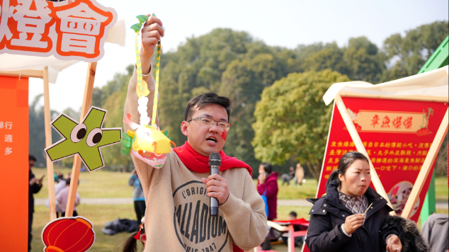 10日,在四川成都新津斑竹林景区首届台湾美食年货节活动上,台湾青年李伟国与游客互动。中新社