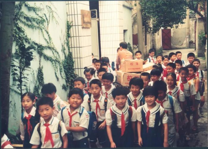 娃哈哈的官网里,如今还展示着一张记录了那段时光的照片:在一群欢笑着的小学生中间,宗庆后骑着三轮车,载着写着“校簿”的货箱,留下一个穿着朴素浅棕色汗衫的背影。