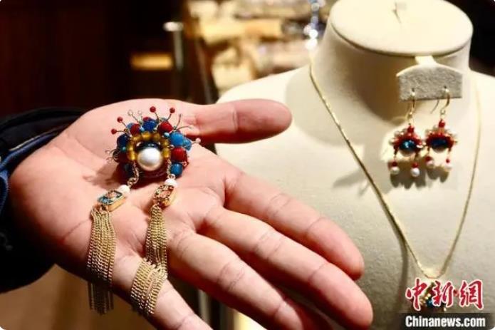 浙江义乌一店铺经营户展示以戏曲脸谱为灵感的中国新国潮饰品。中新网