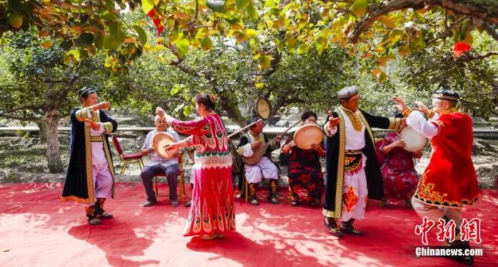 香梨成熟的季节,当地村民喜迎香梨成熟,欢快起舞。中新网