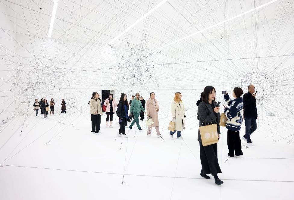 3月21日,阿根廷艺术家托马斯·萨拉切诺的6800立方米网状景观装置作品《算法·韵律》,吸引观众置身其中,感受艺术魅力。(卞程宣/摄)