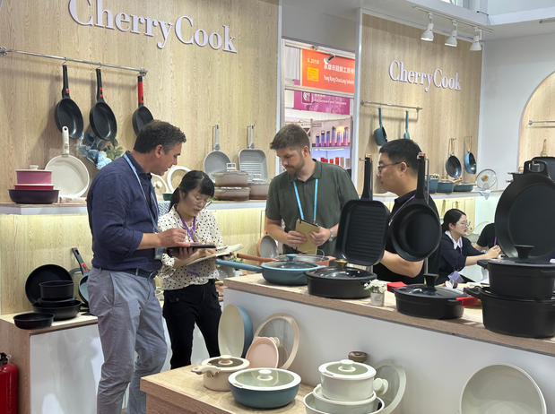 4月25日,境外采购商在第135届广交会了解中国企业展出的餐厨用品。中新社