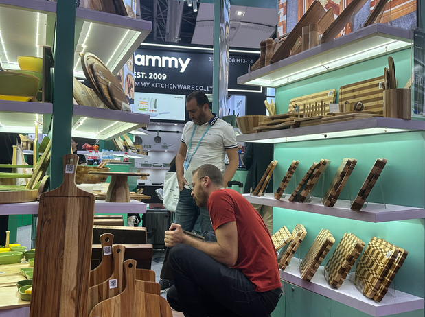 4月25日,境外采购商在第135届广交会了解中国企业展出的木质砧板。中新社